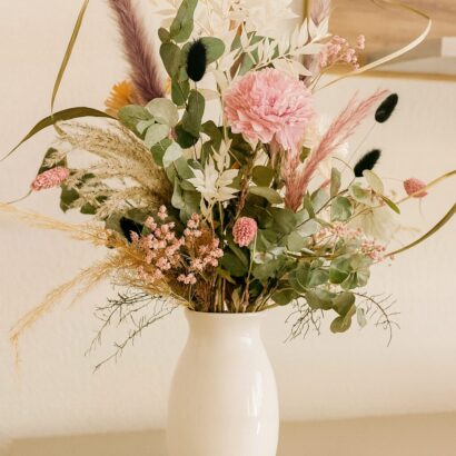This beautiful bouquet is a perfect combination of artificial carnations, eucalyptus, lagurus, pampas grass and natural grasses. Each element has been carefully selected to create a harmonious and stylish design. The dried flowers are a great choice for those who want a long-lasting and low-maintenance decoration. Our bouquet will give you years of pleasure. You can display it in a vase or use it as a wall decoration to add a touch of elegance to your home. The bouquet is not only a great choice for your own home, but also a perfect gift for friends and family on various occasions such as birthdays, weddings or simply to show them how much you appreciate them.