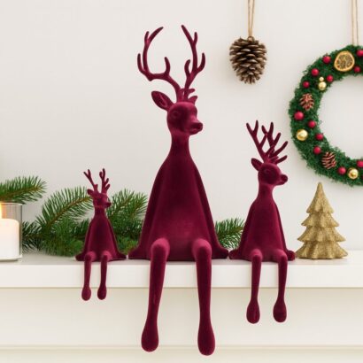 Diese stilvollen Kantenhocker-Hirsche mit beflockter Oberfläche sind das Highlight jeder festlichen Dekoration. Mit ihrem edlen, samtartigen Look und der festlichen Farbe Burgund bringen sie Glanz und Eleganz in dein Zuhause.