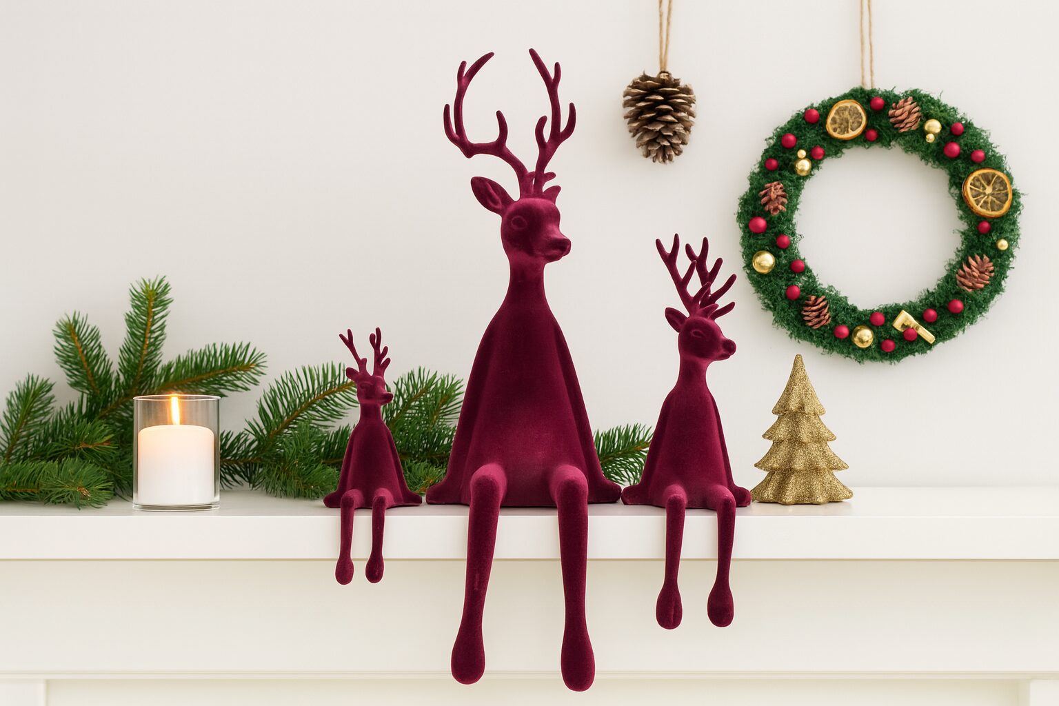 Beflockter Deko-Hirsche mit Samtoberfläche – in Burgund, perfekt für die Weihnachtszeit