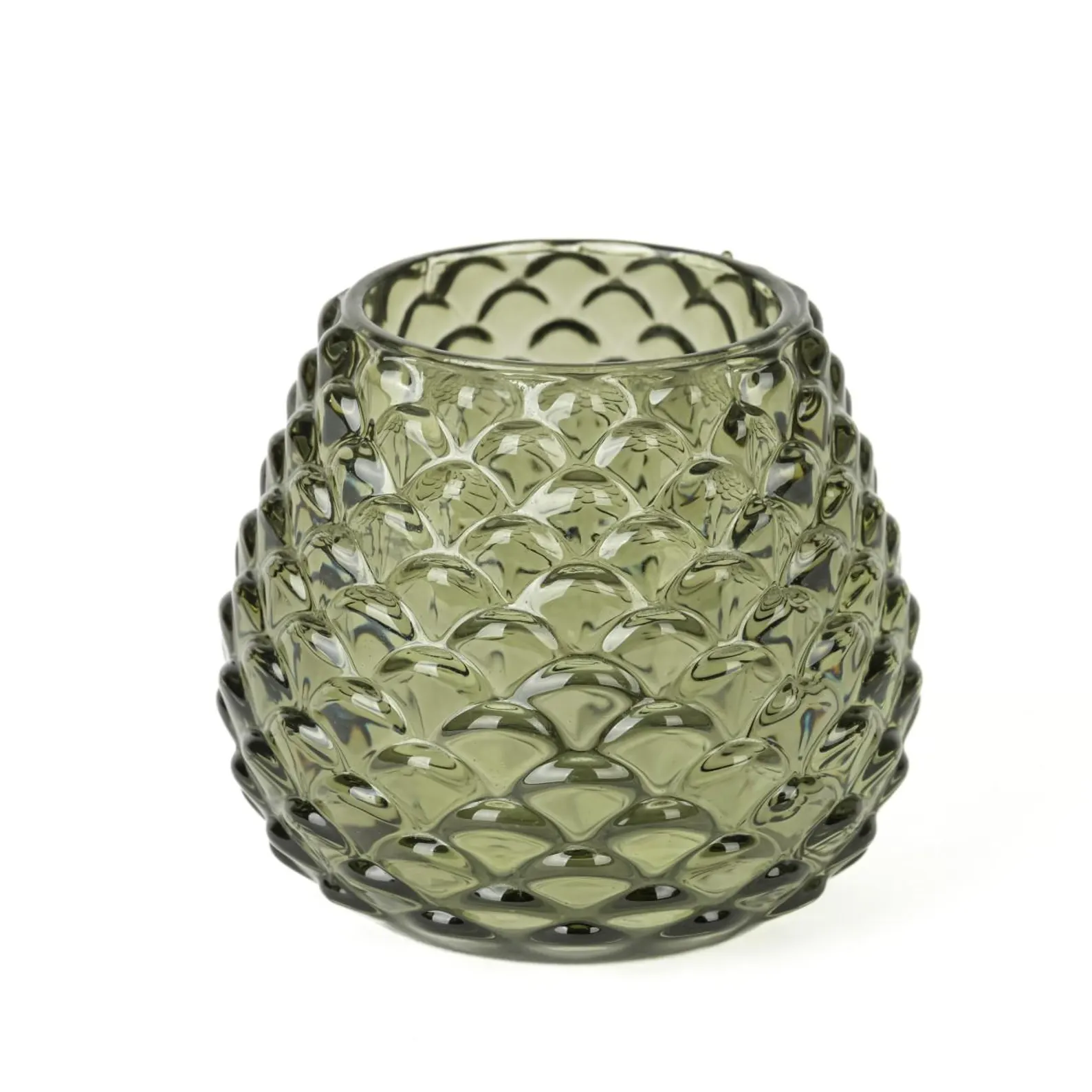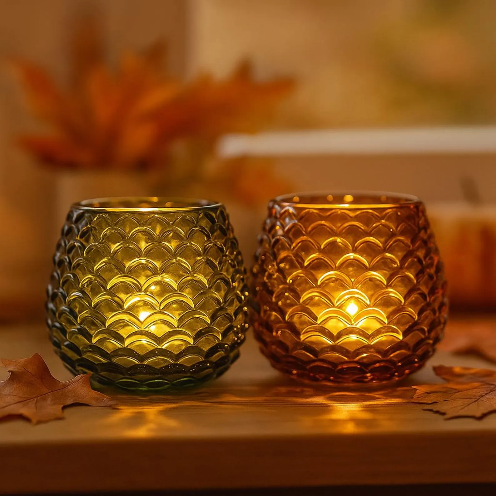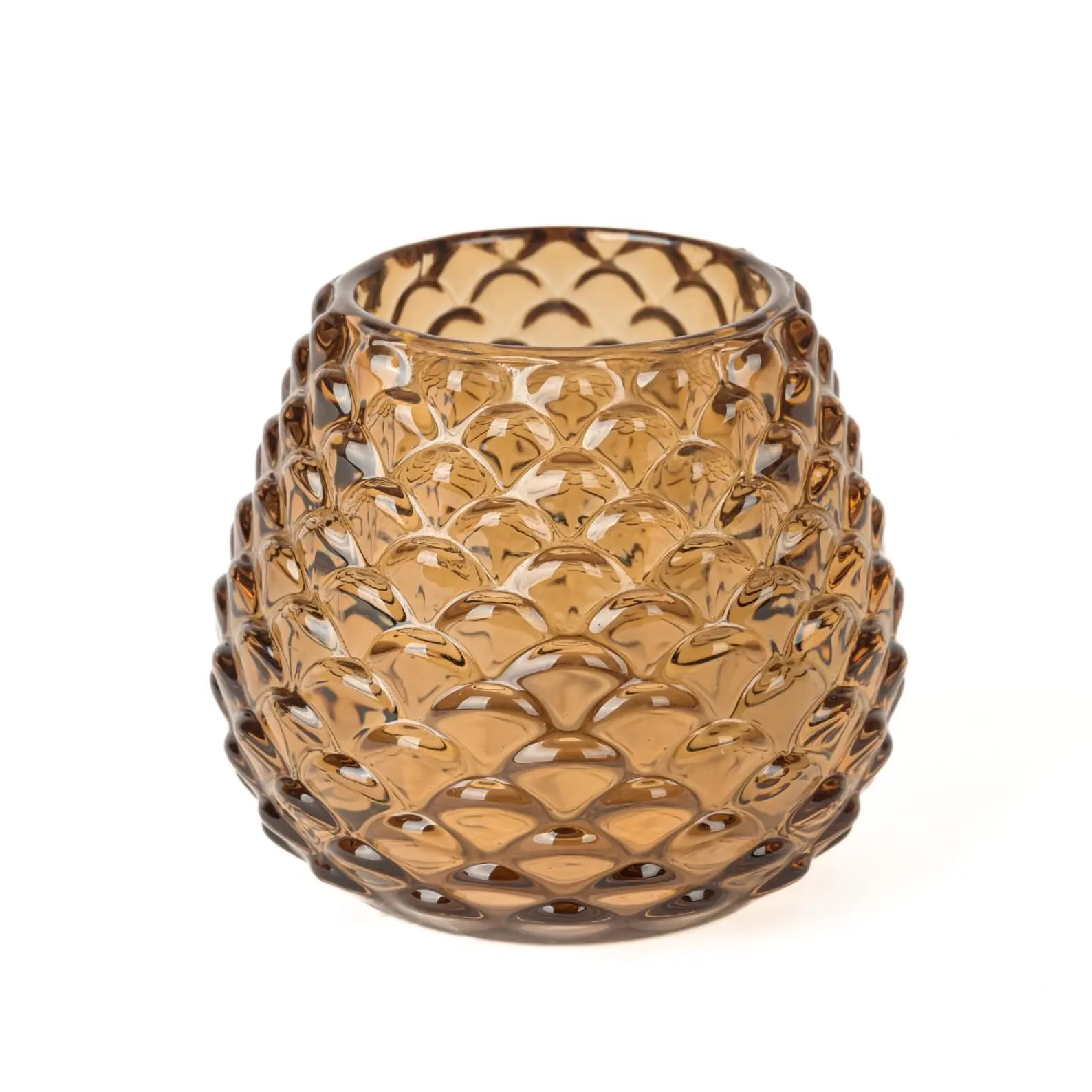 Dieses strukturierte Teelichtglas ist ein echter Hingucker für die herbstliche Tischdeko. Wähle zwischen einem warmen Bernstein-Ton (Amber) oder einem edlen, waldgrünen Farbton – beide Varianten sorgen für eine gemütliche Lichtstimmung in deinem Zuhause. Das dekorative Glas mit reliefartigem Muster erinnert an Tannenzapfen und passt ideal zur natürlichen Herbstgestaltung.