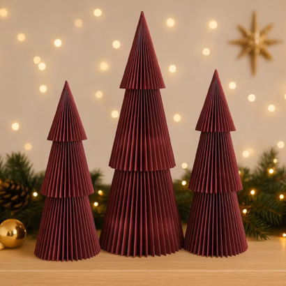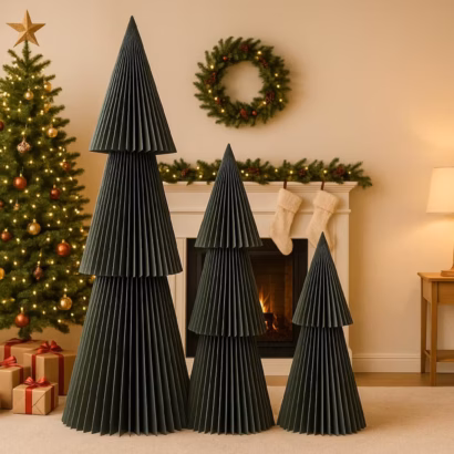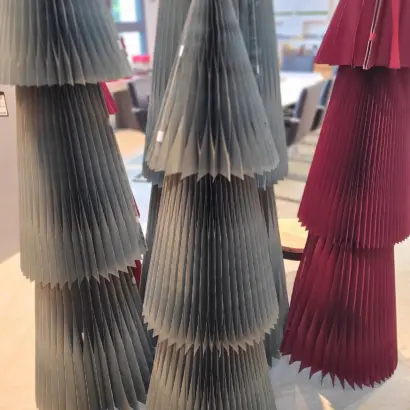 Diese beeindruckenden Papier-Weihnachtsbäume setzen stilvolle Akzente in großen Räumen, Schaufenstern oder auf Events. Die clevere Falttechnik mit Klettverschluss ermöglicht nicht nur platzsparende Lagerung, sondern auch das Stapeln der Bäume für besonders hohe Deko-Varianten.